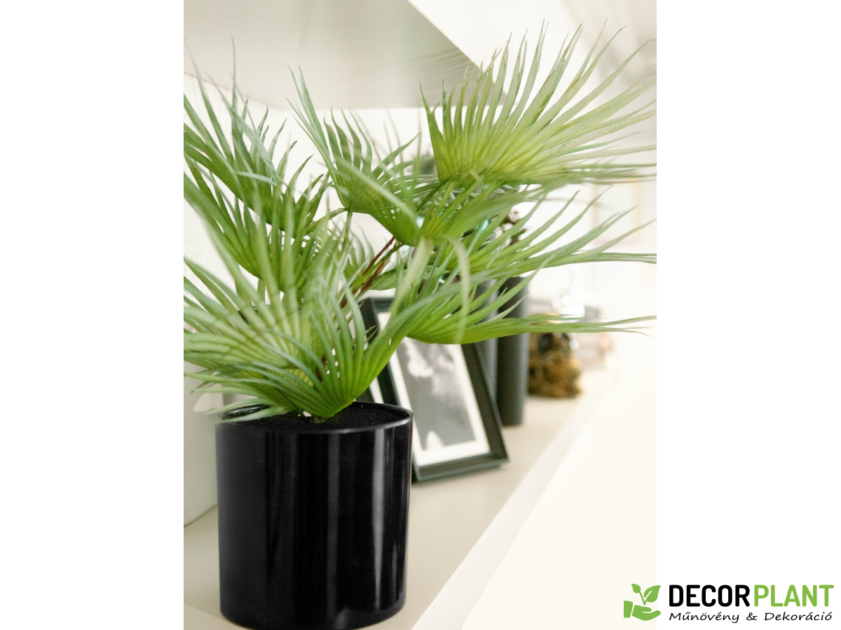 Ez a mini pálmafa a nyár hangulatát viszi a helyiségbe, ha kis asztalnak vagy pultdísznek használjuk. Bármilyen belső stílushoz alkalmazkodik, és természetes modelljéhez képest nem igényel különösebb gondozást. A műpalántában pontosan visszaadták a legyezőpálma jellegzetes jellegzetességeit. Ez különösen jól látható a nagy, szétterülő, legyezőszerű leveleken. A PE felhasználásának köszönhetően a műnövény védett kültéri területeken is használható. A mellékelt Virágcserép mesterséges talajjal van borítva, és Virágcserép állványként és díszedényként is használható.