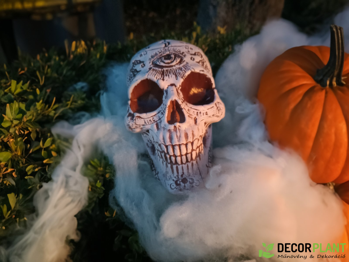 Ijesztõ dekorációként misztikus jelekkel és szimbólumokkal ellátott koponya