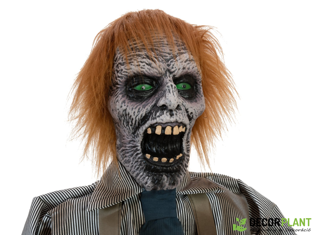 Ijeszto hangulat, mint egy horrorfilmben! Ez az animált zombi figura az Europalms-tol nem való a gyenge szívueknek. Láncfurésszel a kezében a zombi készen áll arra, hogy lecsapjon áldozataira. Annak ellenére, hogy az álló alak dekoratív , csíkos inget visel nyakkendovel és öltönynadrágot, legkésobb a barázdált, szürkére nézve puszta borzalom kerít hatalmába. méregzöld szemgolyó arcát. Vadul kócos hajjal és tátott szájjal a zombi lesben áll a következo áldozatára. Közben egész teste vérszomjban vibrál, és a láncfurész összetéveszthetetlen hangja átjárja a hallgató velojét és lábát. Bal kezében egy levált végtagot tart véres tenyérrel, és úgy tunik, hogy a láncfurész széle is csuromvizes. A dekó figura animációja aktiválható integrált mikrofonon, a “Step here” kapcsolópaddal vagy vezetékes, manuálisan. vezérlés.