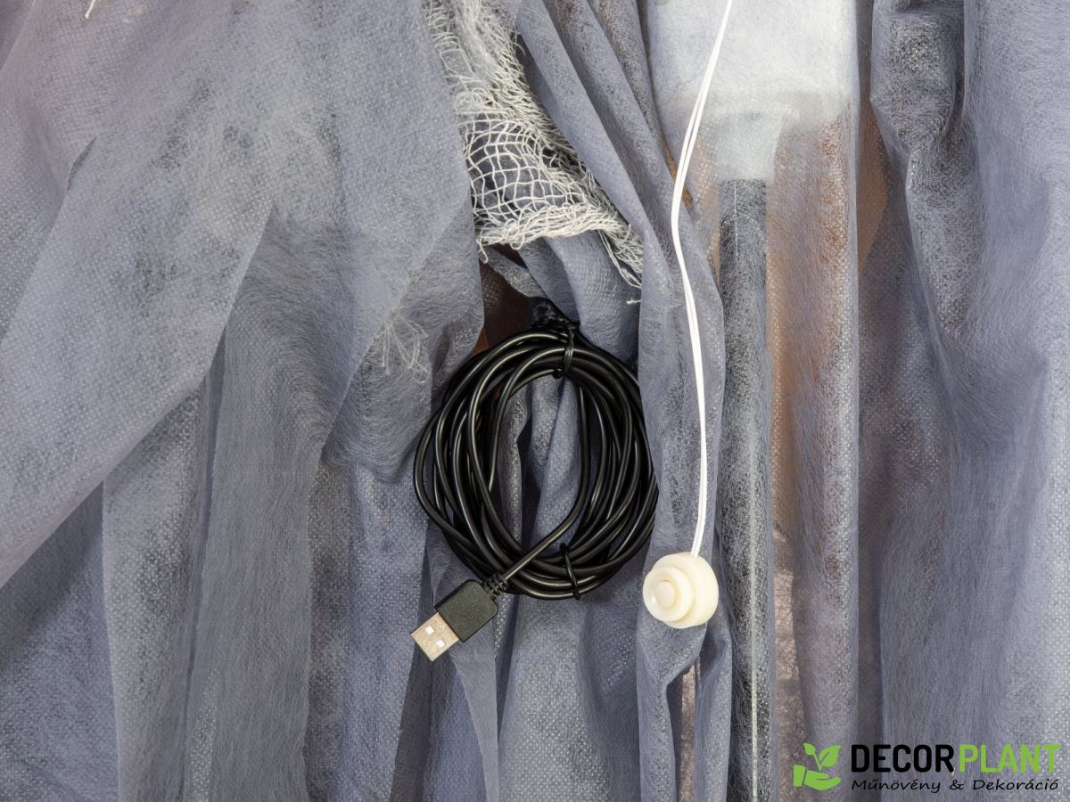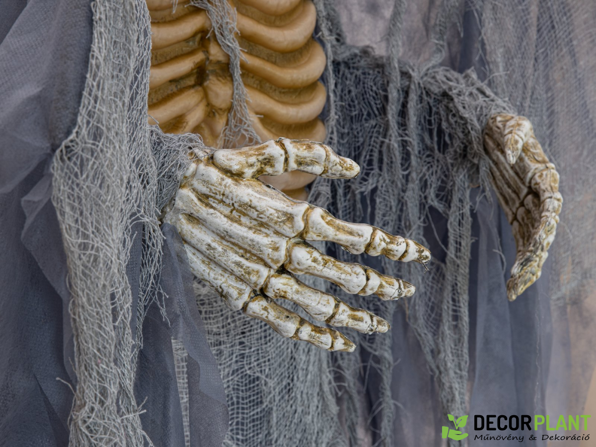 A szemgödörben stroboszkóp piros LED-ek teszik teljessé a kísérteties fényhatást. Egy beépített mechanizmusnak köszönhetoen a Halloween dekorációs figura karjai és szárnyai mozognak, és mintha meg akarnák ragadni a látogatókat, miközben a fej körkörös mozdulatokat végez. Közben hangos nyögés és nyögés hallatszik, láncok csörgésével. Integrált mikrofonnal, a “Step here” kapcsolópaddal vagy vezetékes, kézi vezérléssel aktiválható a dekoratív figura animációja. A Halloween figura elemrol muködik, USB-A kábel 5 V-os muködéshez power bankon vagy tápegységen keresztül.