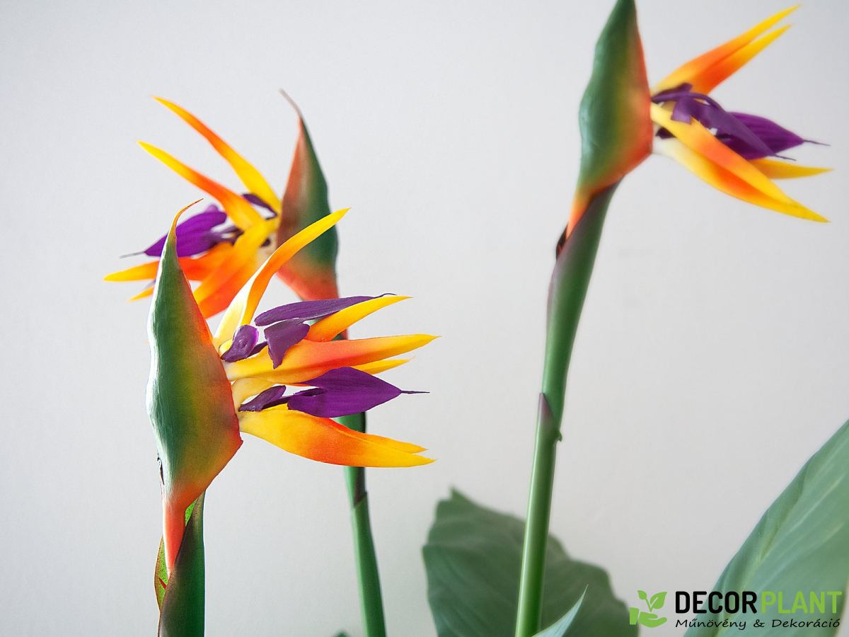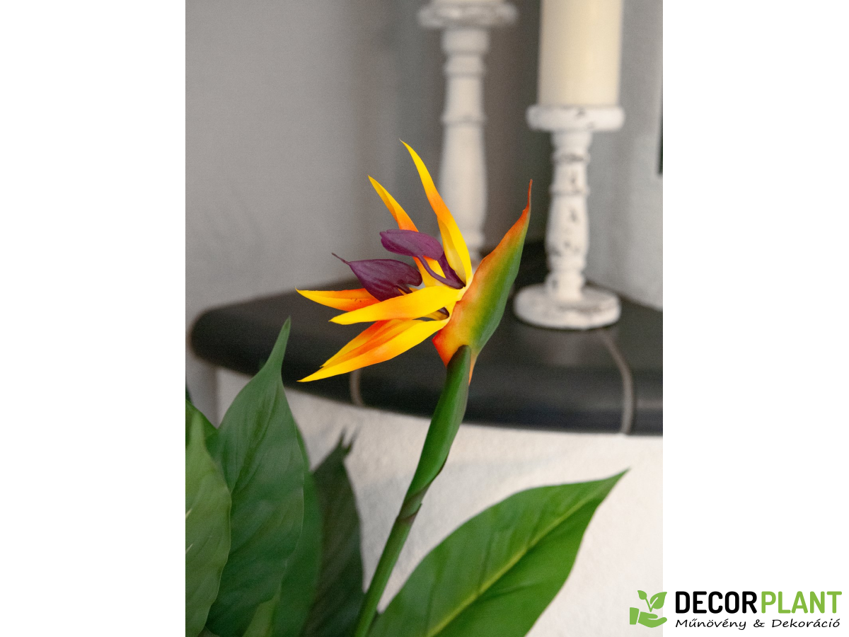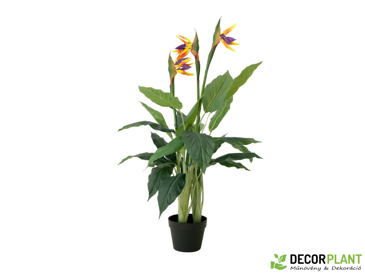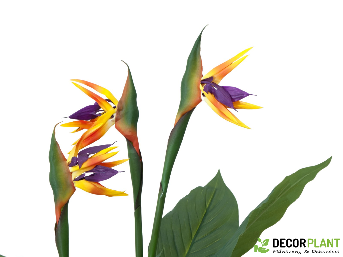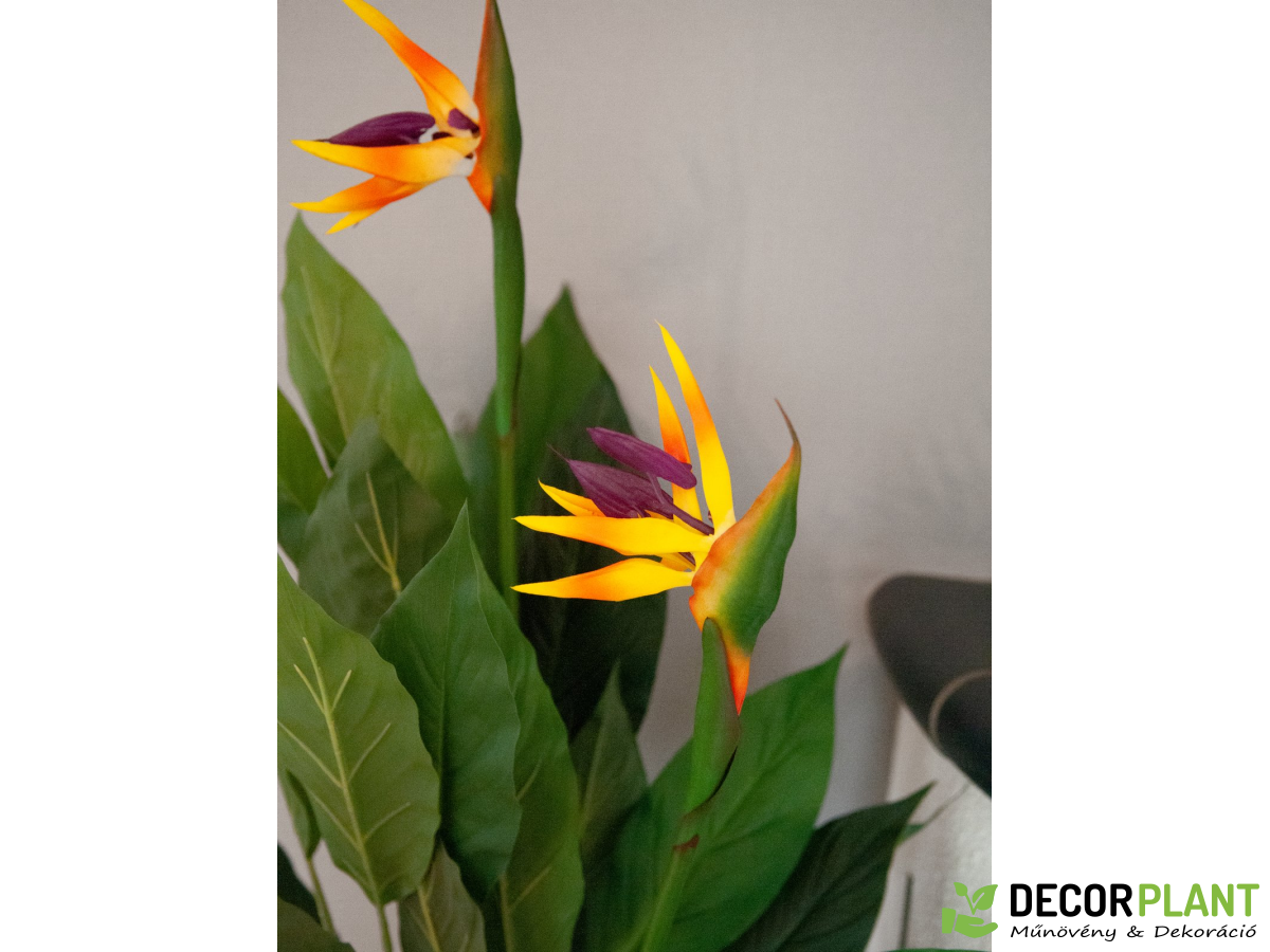 Az eredetileg Dél-Afrikában és a Kanári-szigeteken őshonos növény nevét virágai egzotikus megjelenésének köszönheti – paradicsommadarak. A nappali vagy az irodák díszítőelemeként a legmagasabb igényeket is kielégíti. A nagy, bőrszerű levelek a banánnövényére emlékeztetnek, és kiváló minőségű ponyvából készültek, jellegzetes levéldomborítással. Három nyitott virág élénk színekben teszi teljessé a 90 cm magas növény lenyűgöző megjelenését. A virág egy foglalat kertész cserépben kerül forgalomba, amely Virágcserépbe helyezve a növény stabilan áll. UV-védő spray, hogy sokáig élvezhesd műnövényed.