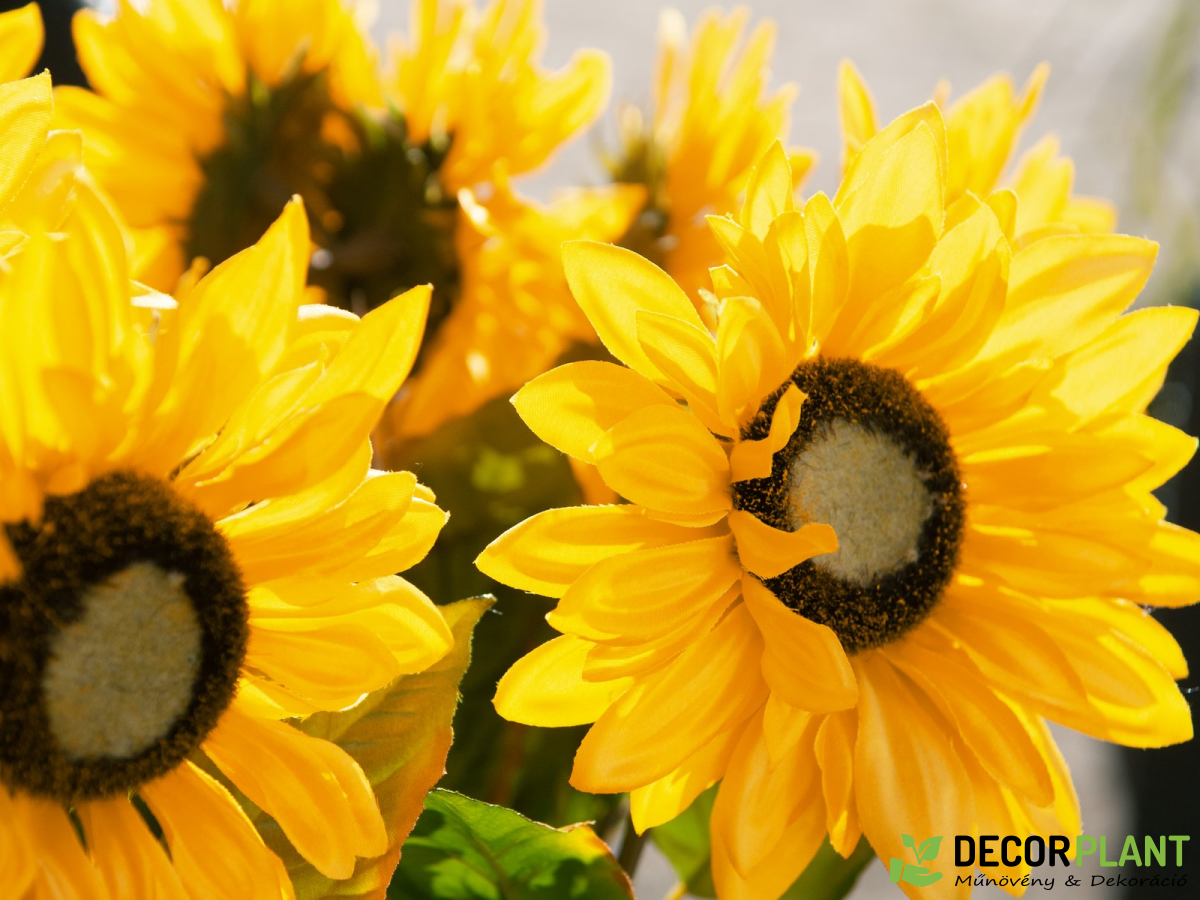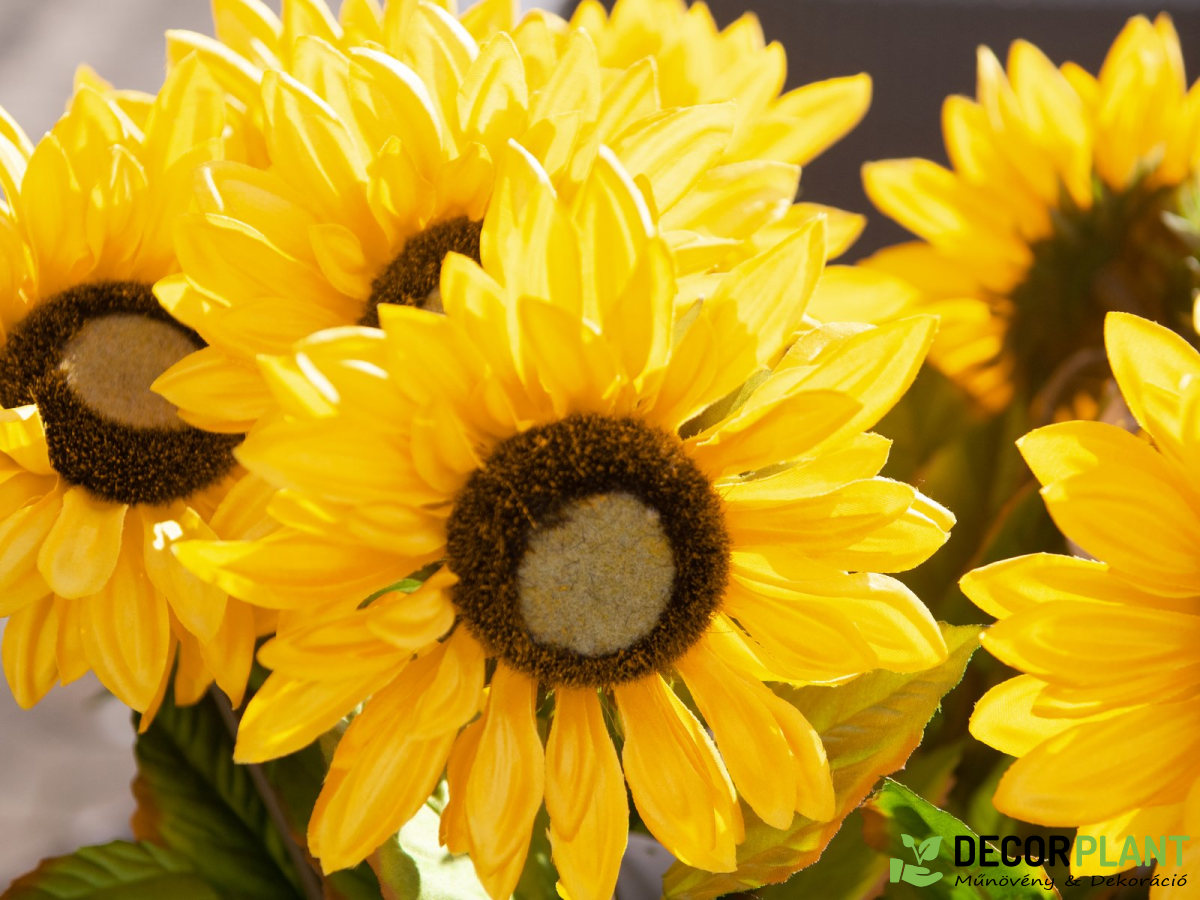 Az Europalms műnapraforgójával egy darab nyár és napfény kerül otthonába. Legyen szó pazar elrendezésről egy nagy vázában, vonzó nyári és őszi dekorációba integrálva, vagy asztali és pultdíszként – fedezze fel dekorációs tehetségét!A művirág PE-ből és textilanyagból készült, teljes magassága kb. 70 cm. Természetes modelljének megfelelően a virágzat zöld virágkosárból áll, élénksárga sugárvirágokkal és belső barna csőszerű virágokkal. A száron elrendezett váltakozó lomblevelek erezett szerkezettel és enyhén barna színű fűrészes széllel kerekítik le a természetes megjelenést.