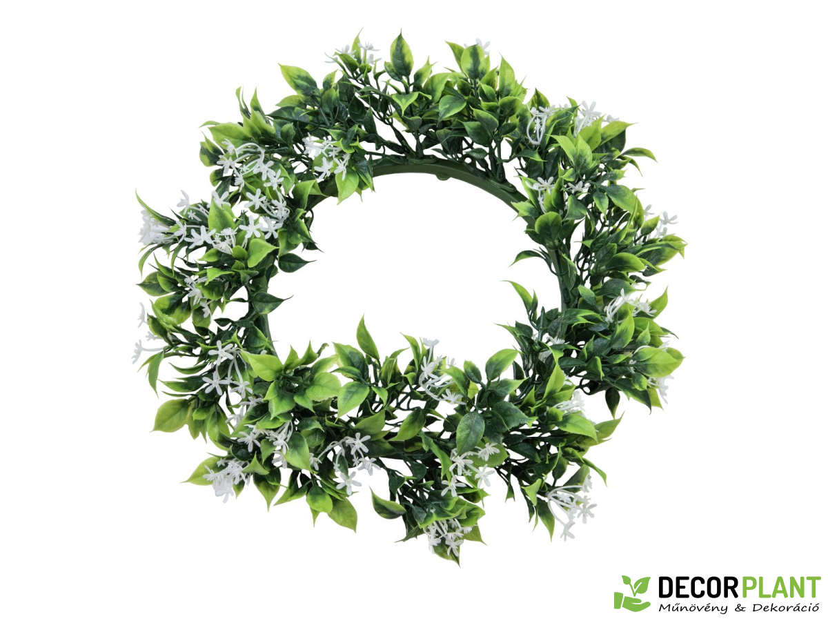 Az Europalms mesterséges jázminkoszorúja körülbelül 30 cm átmérőjű. Zöld lombozata és dekoratív fehér virágai teljes egészében PE-ből készültek, ezért kültéri használatra is kiválóan alkalmasak. Ajtókoszorúként várja látogatóit és vásárlóit, vagy mint egy reprezentatív díszítőelem, amely pillanatok alatt vonzó nyári hangulatot kölcsönöz erkélyének, teraszának vagy nappalijának. A koszorú keresztelők vagy esküvők asztali díszeként is ideális.